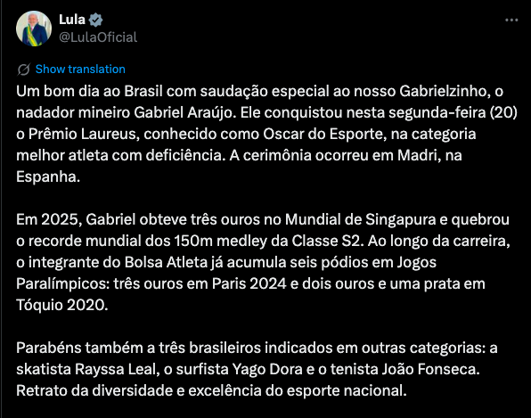 Um bom dia ao Brasil com saudação especial ao nosso Gabrielzinho, o nadador mineiro Gabriel Araújo. Ele conquistou nesta segunda-feira (20) o Prêmio Laureus, conhecido como Oscar do Esporte, na categoria melhor atleta com deficiência”, escreveu Lula