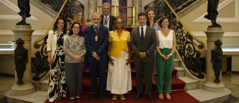 A Fundação Biblioteca Nacional (FBN) – vinculada ao Ministério da Cultura (MinC) – recebeu na manhã desta sexta-feira (17/4) a visita do ministro da Educação, Leonardo Barchini, e comitiva. O ministro se reuniu com o presidente da FBN, Marco Lucchesi, com a presença da presidente da Coordenação de Aperfeiçoamento de Pessoal de Nível Superior (CAPES), Denise Pires Carvalho, e da secretária de Educação Básica do MEC, Kátia Schweickardt. A diretora de Apoio à Gestão Educacional do MEC, Anita Stefani, também integrou a comitiva. Esta é a primeira visita de um ministro da Educação à Biblioteca Nacional nos últimos 43 anos.